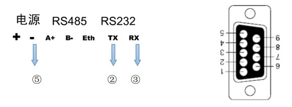 注明:RS485通信时接A和B即可,RS232通信时接TX、RX和电源地(负极)。